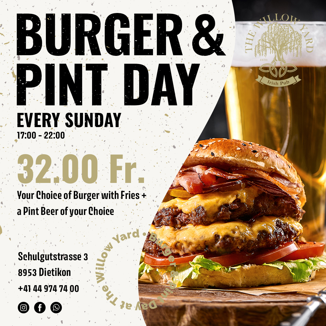 “I’m just here for the burgers and beer”. Check out our amazing range of homemade burgers and add your favourite pint of beer. What better combination! Every Sunday from 17.00 – 22.00.